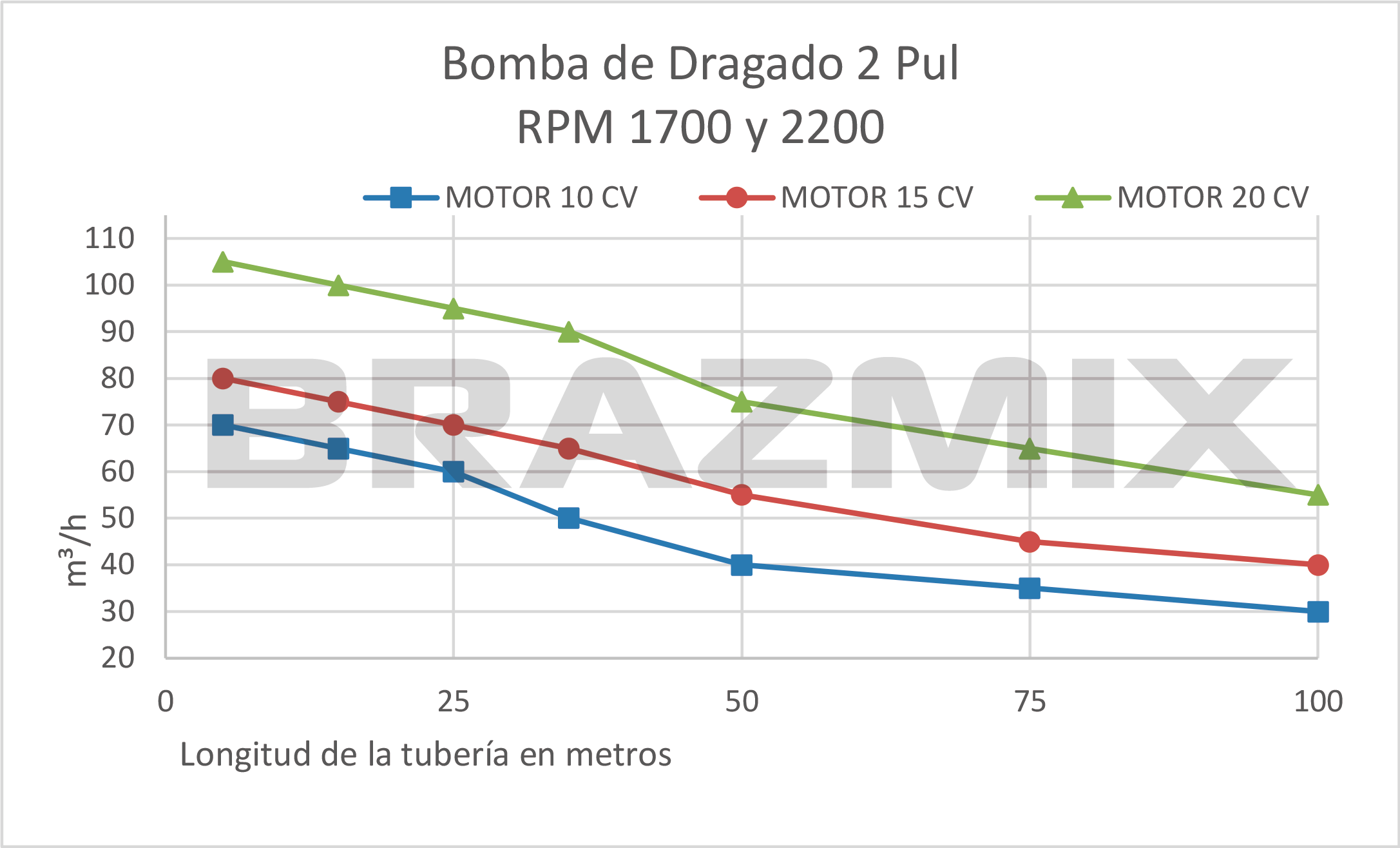 - Dependiendo de la longitud y el desnivel de la tubería, puede ser necesario un motor de mayor potencia (hp), pero esto no aumentará el caudal (m³/h).