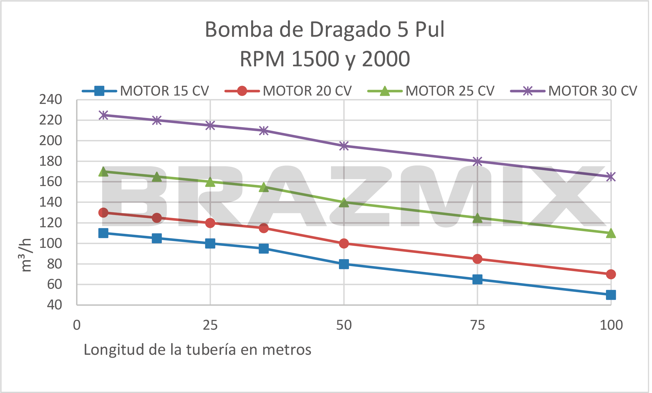- Dependiendo de la longitud y el desnivel de la tubería, puede ser necesario un motor de mayor potencia (hp), pero esto no aumentará el caudal (m³/h).