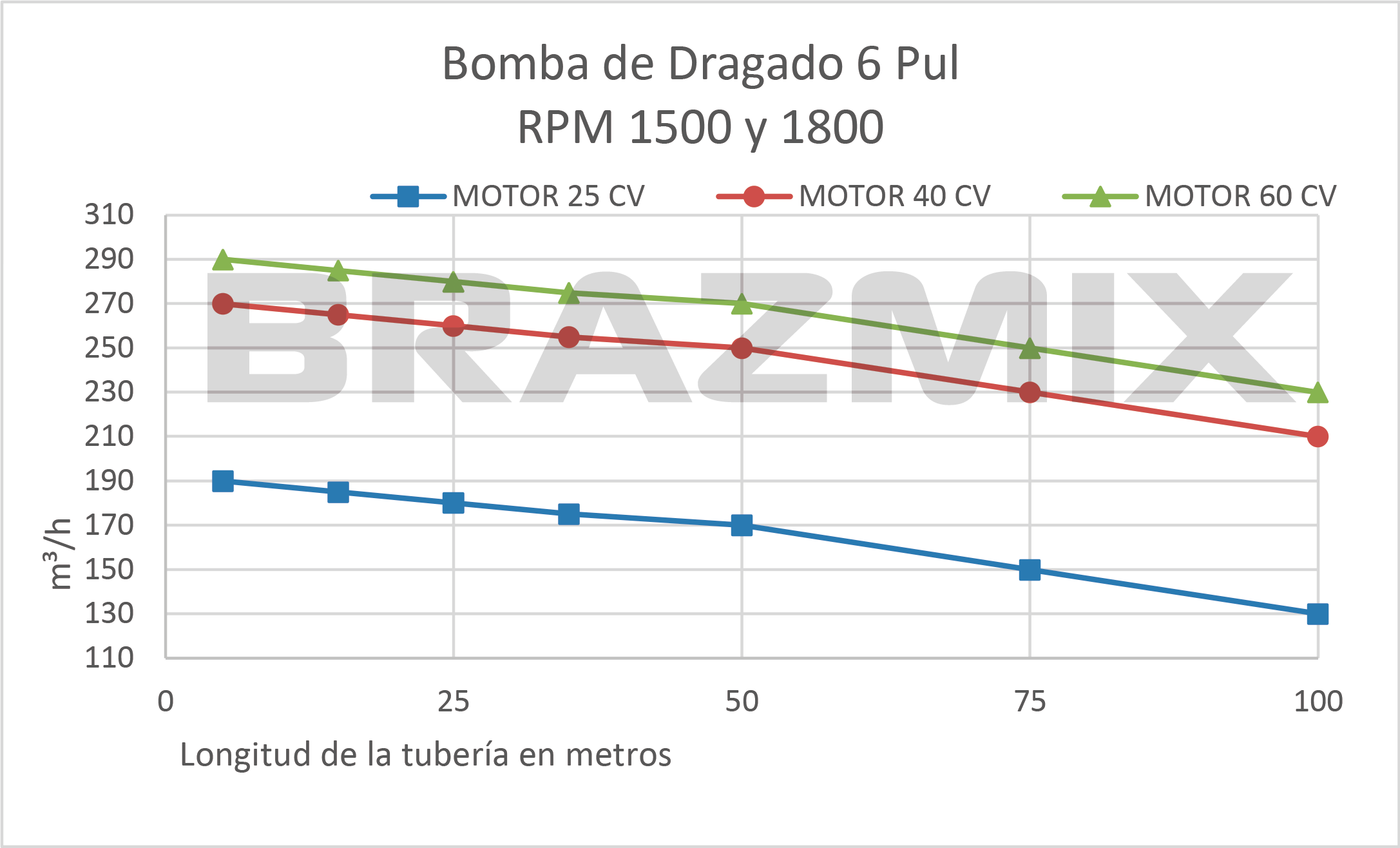 - Dependiendo de la longitud y el desnivel de la tubería, puede ser necesario un motor de mayor potencia (hp), pero esto no aumentará el caudal (m³/h).