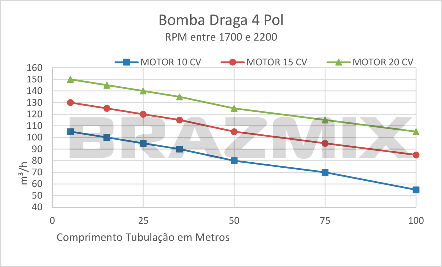 - Motores com potência superior (cv) podem ser necessários dependendo do comprimento e desnível da tubulação no serviço a ser realizado, porém não farão a bomba render mais m³/h.