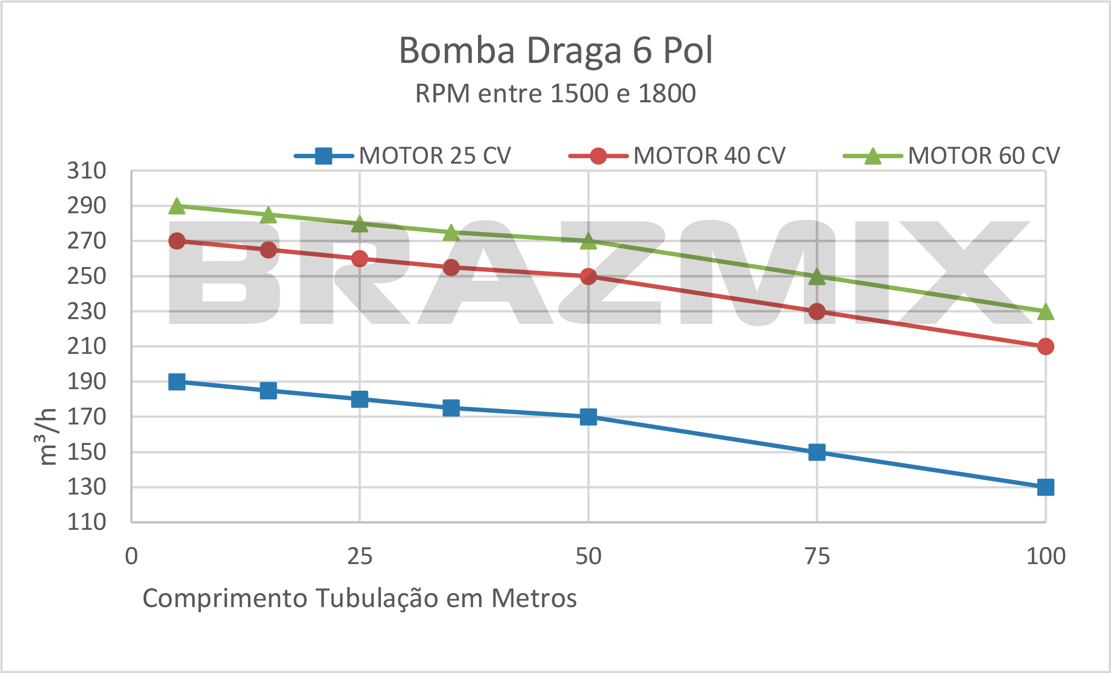 - Motores com potência superior (cv) podem ser necessários dependendo do comprimento e desnível da tubulação no serviço a ser realizado, porém não farão a bomba render mais m³/h.