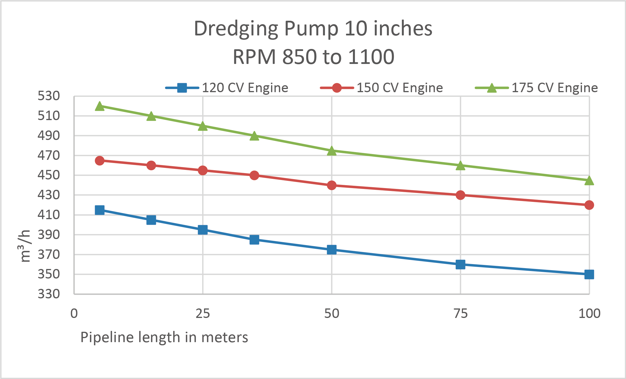 - Engines with higher power (hp) may be necessary depending on the length and drop of the pipeline in the service to be performed, but will not make the pump deliver more m³/h.