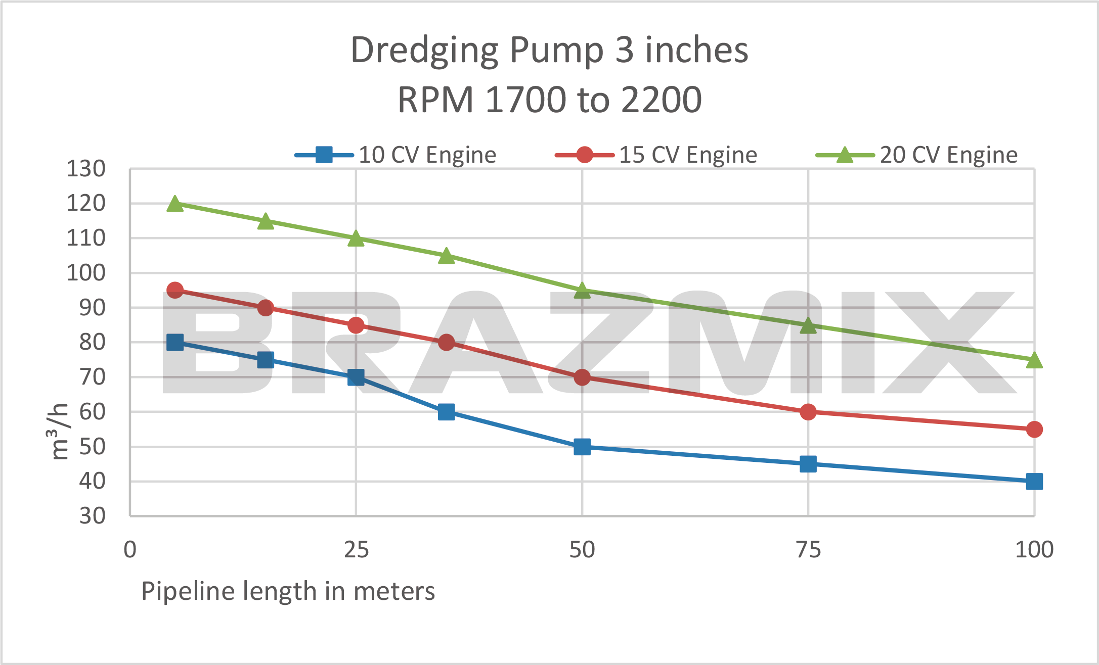 - Engines with higher power (hp) may be necessary depending on the length and drop of the pipeline in the service to be performed, but will not make the pump deliver more m³/h.