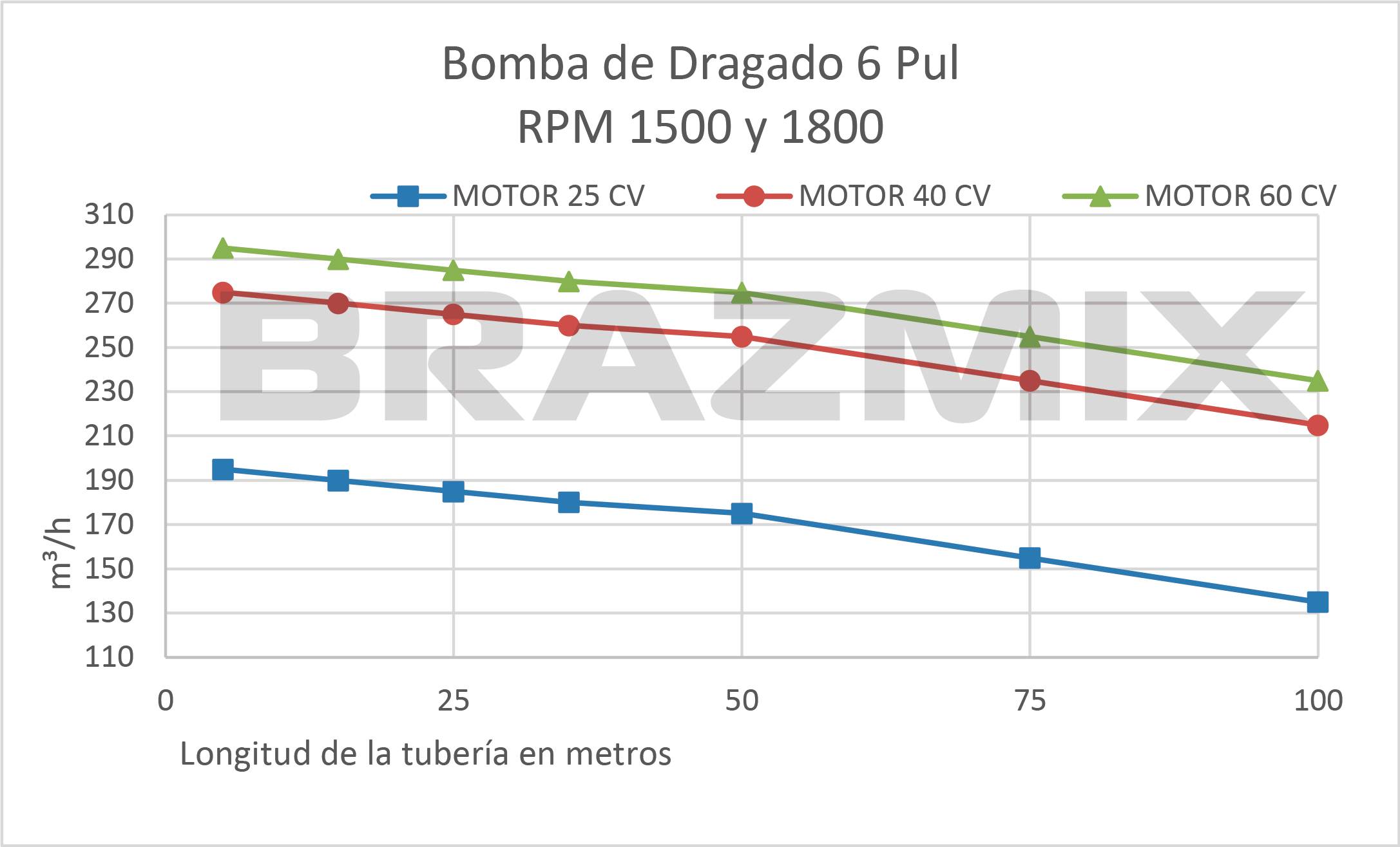 - Dependiendo de la longitud y el desnivel de la tubería, puede ser necesario un motor de mayor potencia (hp), pero esto no aumentará el caudal (m³/h).