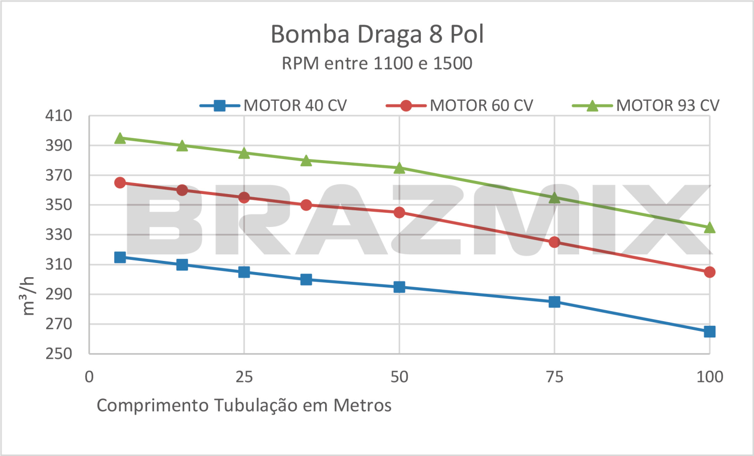 - Potências recomendadas de motores (elétricos ou combustão) são 40 cv, 60 cv e 93 cv com rotação contínua entre 1100 e 1500 RPM no eixo da bomba.
