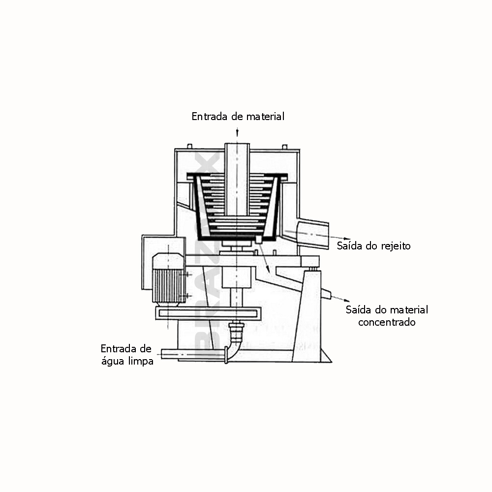 Concentrador centrífugo para o processamento de minério proveniente de moinhos de martelo bola.